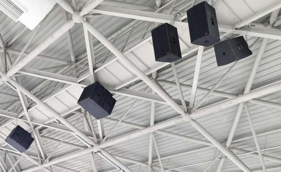 主擴音箱采用SR1562全頻音箱,吊裝在場地兩側(cè),根據(jù)健身房的實際長度調(diào)整每只音箱音域的輻射角度,確保覆蓋無死角,作為全場的主擴聲使用。