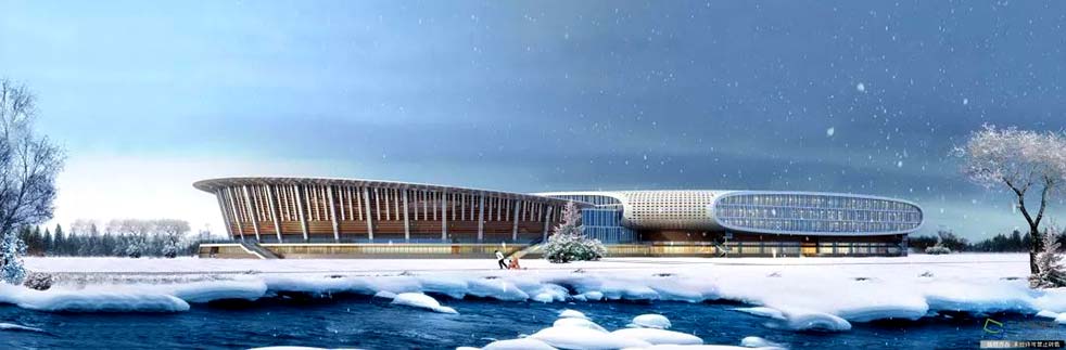 北京市冰上項目訓練基地位于延慶城中心,總建筑面積8萬多平方米,主要包括綜合訓練館、教學管理公寓樓及其他附屬設施。從空中俯瞰,圓角方形場館和半圓形場館連成一體,西側(cè)綜合館為半圓形,如同半個“冰球”,東側(cè)訓練館為八邊形,似一個方形的“冰壺”。