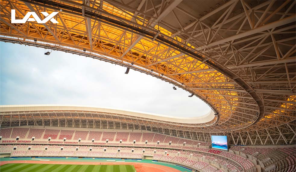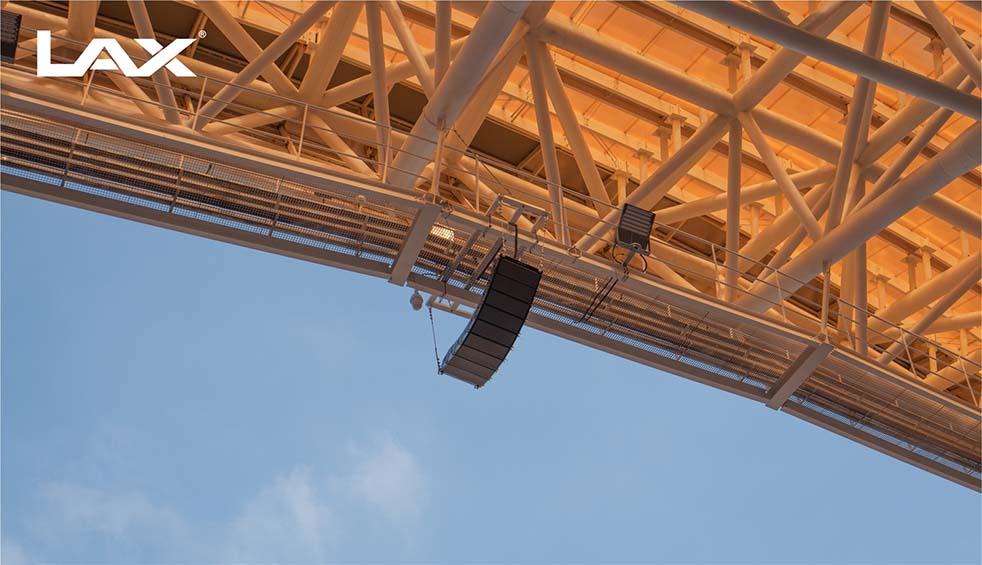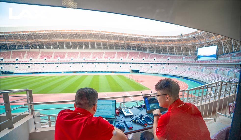 LAX總工程師趙春寧在恩賈梅納體育場實地勘測,調整揚聲器的中高頻指向性,通過波長陣列揚聲器在體育場館的應用,確保聲音在場館能夠更加清晰穩定和均勻覆蓋全場。