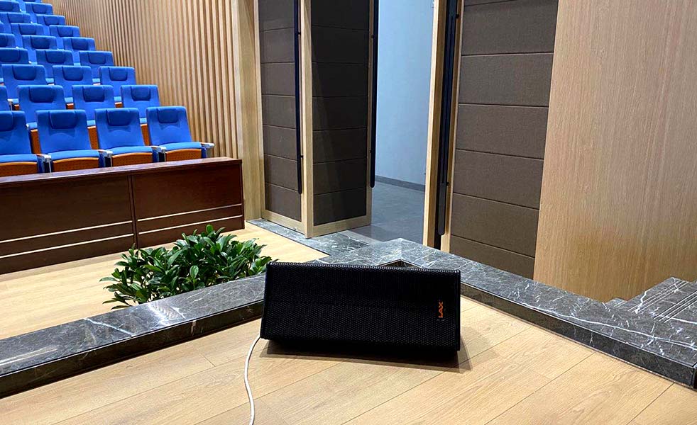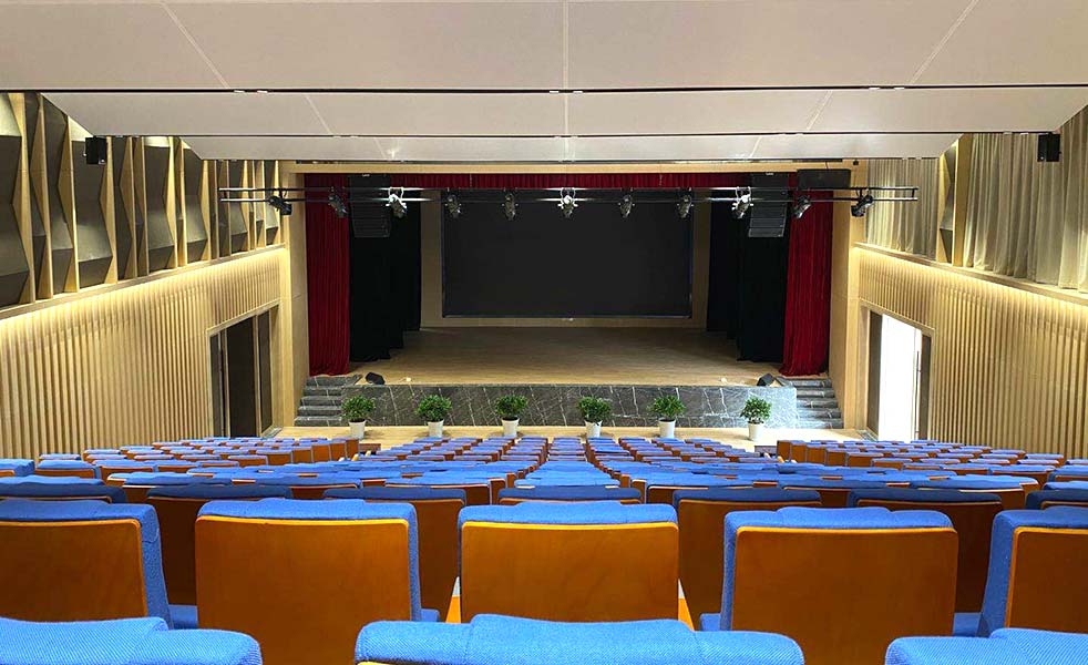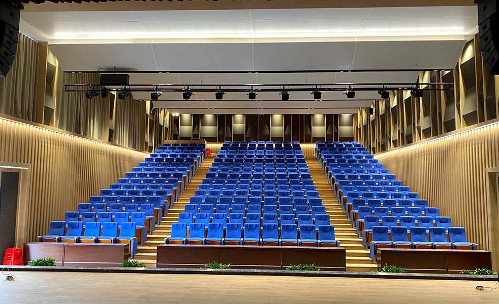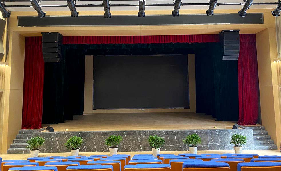 報告廳左右吊掛主擴線陣揚聲器AT208+AT215B(8+2),使用了兩只U26返聽和四只U6輔助。