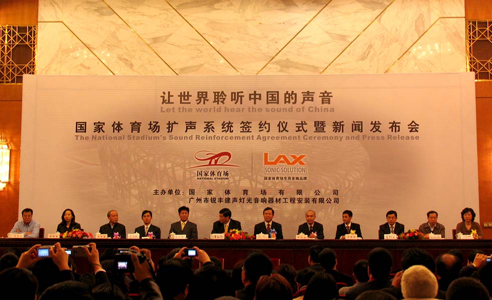 2006年12月8日,LAX以唯一一家中國品牌的身份擊敗國內外競爭對手,簽約成為國家體育場“鳥巢”專用音響品牌,實現了奧運主場館采用中國音響零的突破。隨后更是拿下了近1/6的北京奧運比賽場館擴聲工程項目。“鳥巢”共使用236只雙十二寸全頻線陣列揚聲器,均勻覆蓋觀眾席與場地區域。