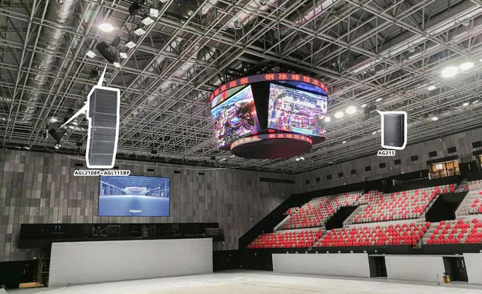 ②由于冰球館的特殊性,日常為國家冰球隊的訓練場地,還兼容籃球館。冰球比賽(訓練)時,場地為冰面,四側的流動座位會收起來。由于冰面的關系,在揚聲器布置方面,要保證精確的指向性,減少無用的聲反射,提高語言清晰度。故此擴聲系統(tǒng)選擇指向性高的AGL 2108P單8寸線陣列揚聲器。除此以外,考慮冰面會產生水汽,讓場館濕度升高,所選揚聲器要考慮防水處理。而AGL 2108P的箱體為塑料與傳統(tǒng)的揚聲器木質箱體有所不同,正適合冰球館的環(huán)境要求。