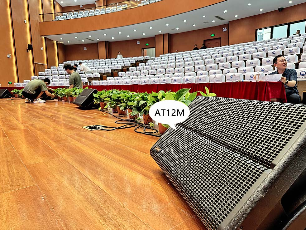 舞臺臺口均勻擺放4 只流動返送揚聲器LAX AT12M,用于舞臺內監聽。