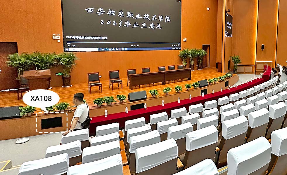 舞臺臺唇選用4只LAX XA108全頻揚聲器,隱藏安裝在舞臺前側,給觀眾席前區補充聲源。