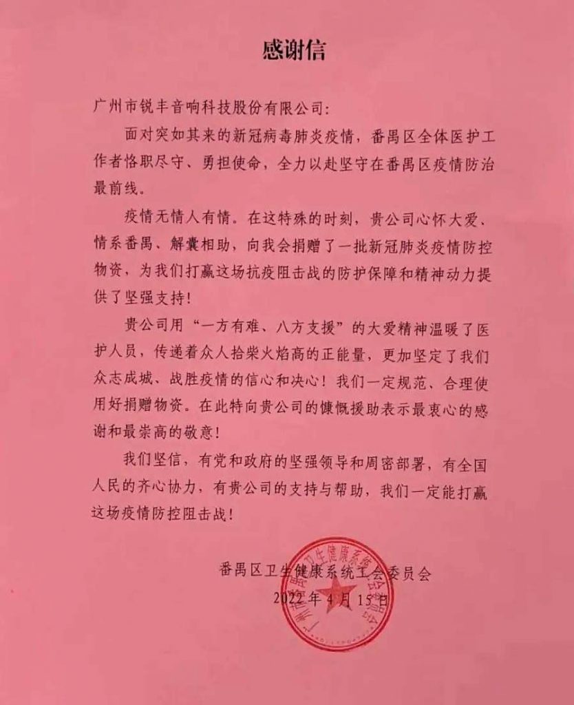 疫情爆發初期至今銳豐科技持續關注新型肺炎疫情動態始終把社會責任放在前位多次向全國各地捐贈音響設備共計3000+套幫助宣傳抗擊疫情的防控和注意事項共同抗擊疫情展現抗疫時期對廣大人民與奮戰在抗疫一線人員的支持!